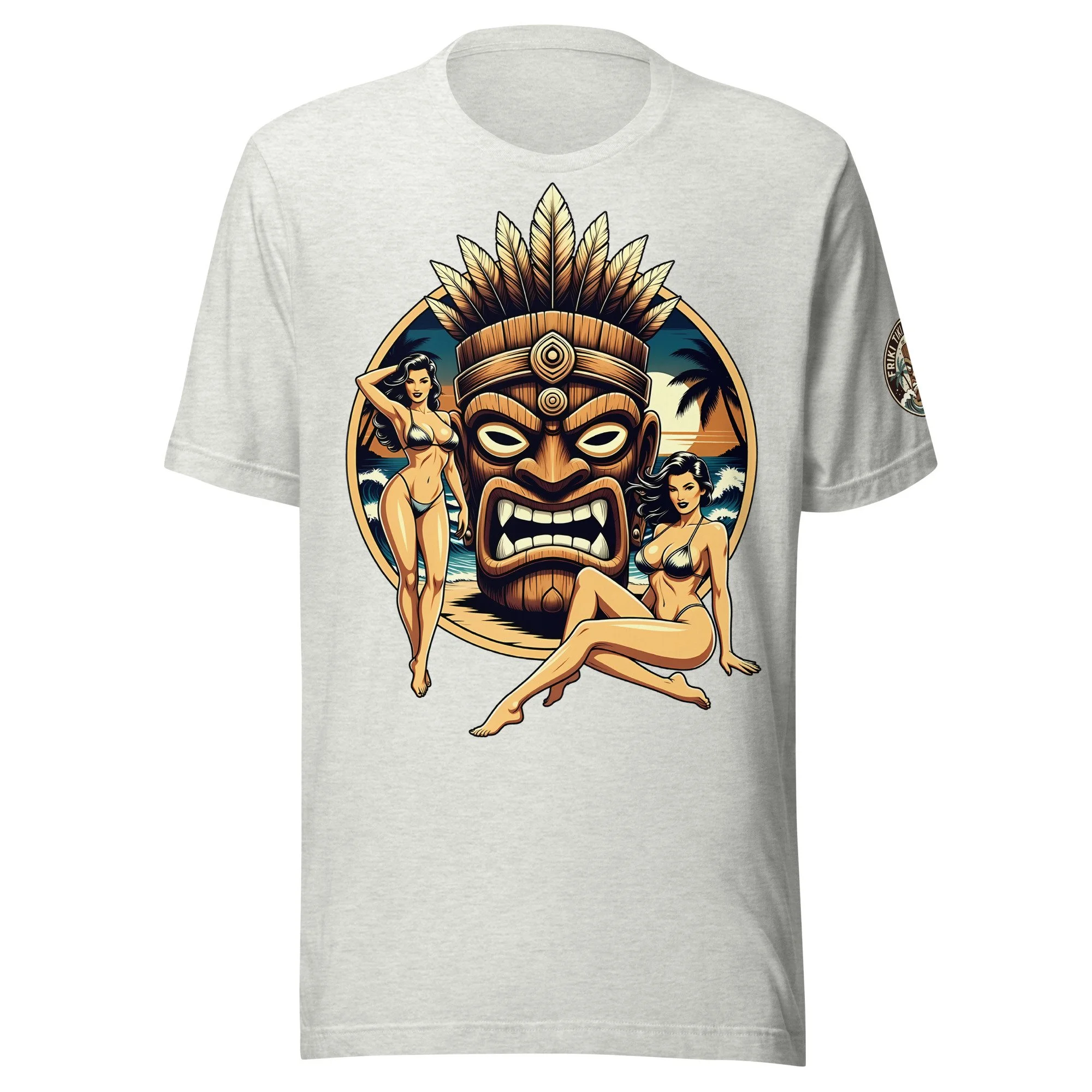 A bold tiki centerpiece framed by vintage-inspired tropical elements gives this piece that timeless surf feel with a Friki Tiki edge.
